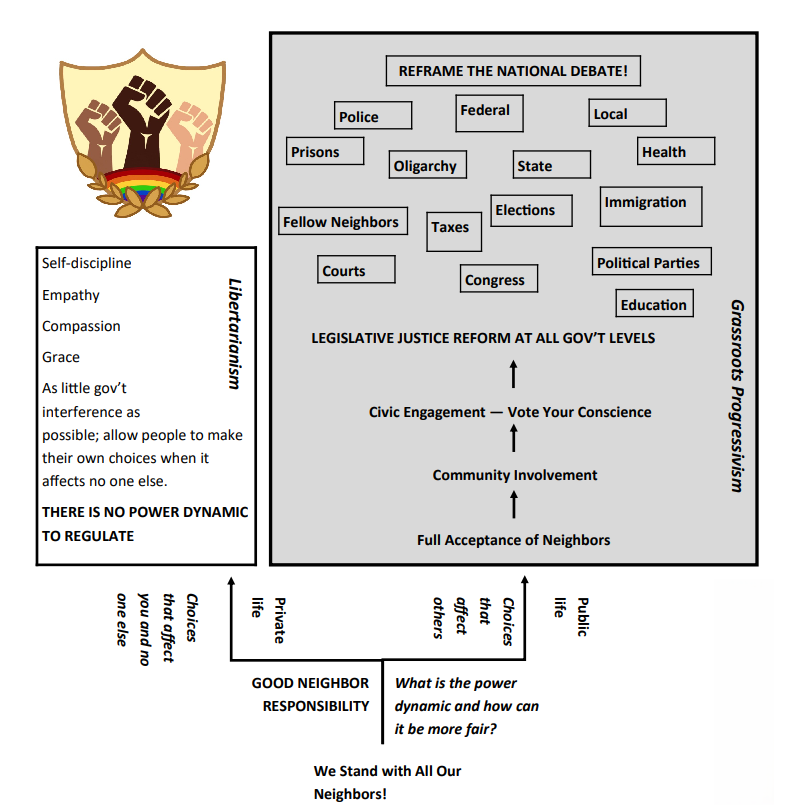From here, we build our platform, one which balances the power between Neighbors and police, government, courts, corporations, billionaires, and even our Fellow Neighbors. For example, we can begin to shift what it means to be a police officer or abolish the police altogether, replacing it with something designed to be a part of the community rather than above it. We can end qualified immunity as it is a clear form of injustice, making it nearly impossible to bring bad cops to account. In all instances, we filter each situation through our justice lens. We ask ourselves, "What is the power dynamic and how can it be more fair?"